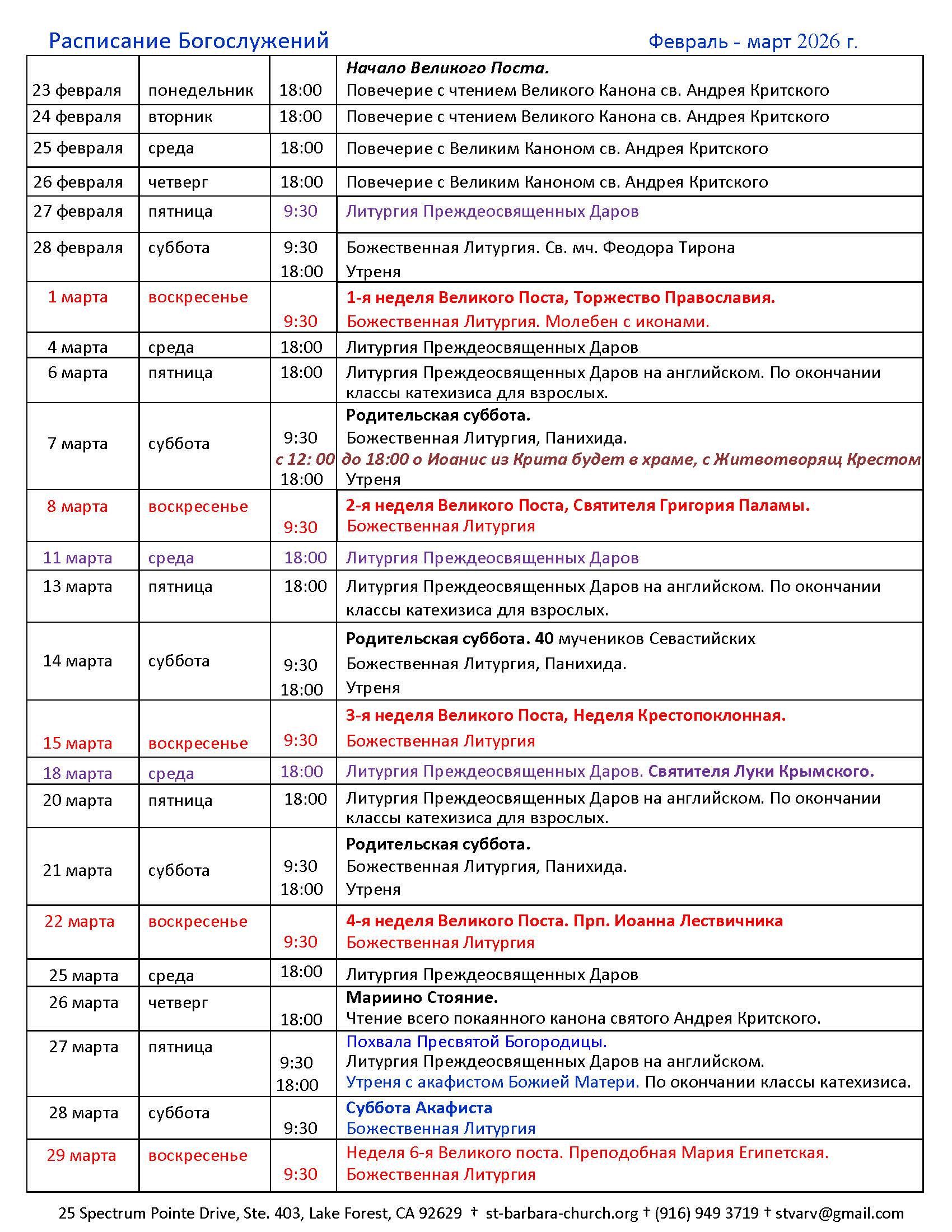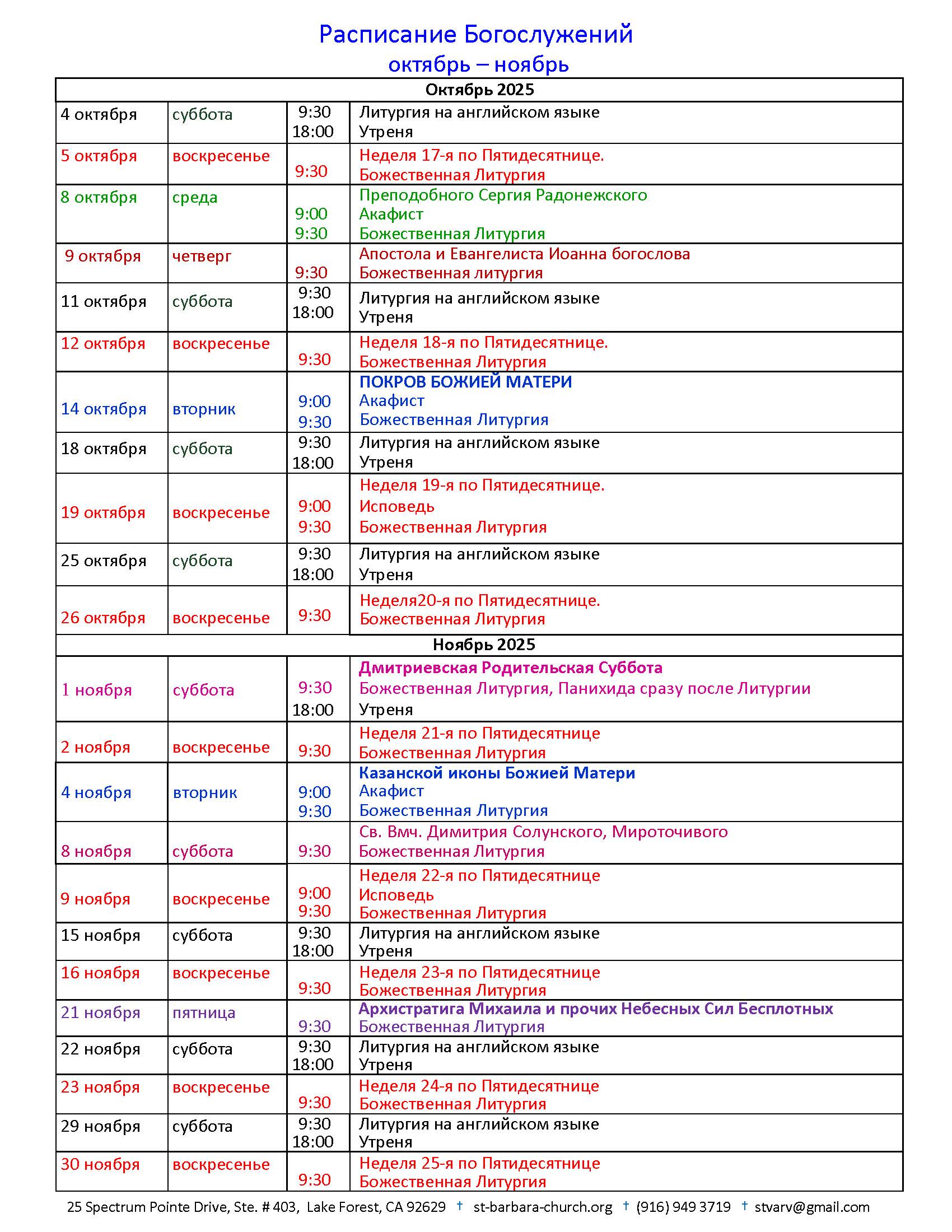 Приход Святой Варвары живет по Юлианскому календарю, также как и Православные Церкви России, Сербии, Грузии, Афона и Святой Земли. Службы в субботу вечером и воскресенье утром, в основном, проходят на Церковно-Славянском языке, но вставляются также и английские ектении для наших англоязычных прихожан. В субботу утром Литургия служится полностью на английском языке.