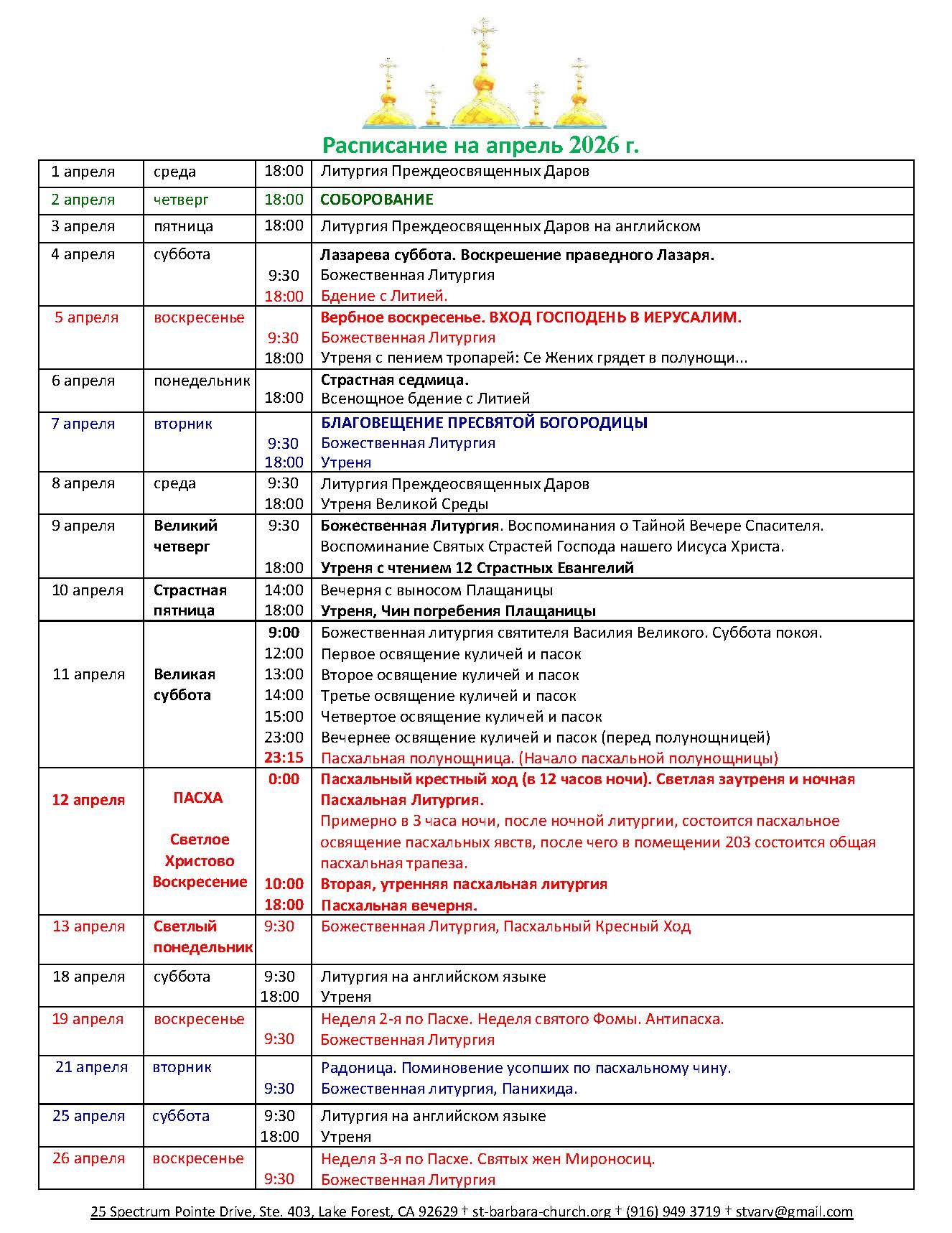 Приход Святой Варвары живет по Юлианскому календарю, также как и Православные Церкви России, Сербии, Грузии, Афона и Святой Земли. Службы в субботу вечером и воскресенье утром, в основном, проходят на Церковно-Славянском языке, но вставляются также и английские ектении для наших англоязычных прихожан. В субботу утром Литургия служится полностью на английском языке.