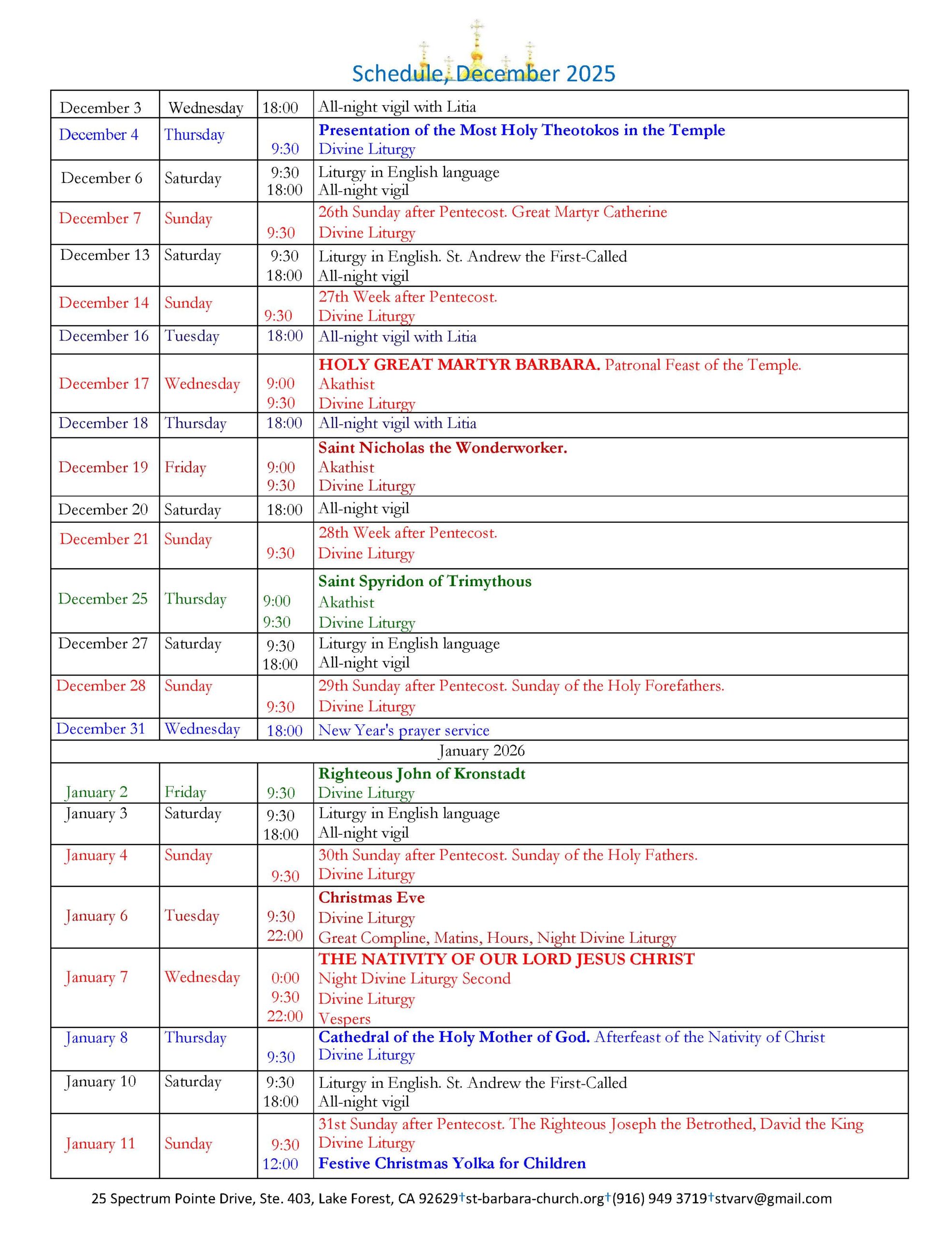 Schedule of Services Print December 25 Users of Apple devices to subscribe to the schedule in your system calendar CLICK HERE Android users you need to install the first ICSx5 app